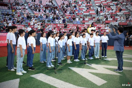 경기 전 애국가를 제창하고 있는 수원시청소년합창단의 모습. 사진 | KT 위즈 |