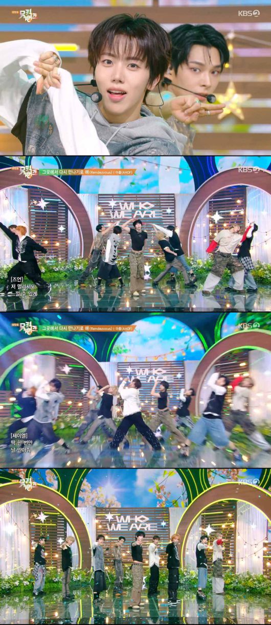 아홉(AHOF)은 4일 오후 방송된 KBS2 '뮤직뱅크'에 출연해 첫 번째 미니앨범 'WHO WE ARE(후 위 아)'의 타이틀곡 '그곳에서 다시 만나기로 해 (Rendezvous)' 무대를 꾸몄다.