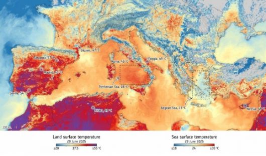 여기에 지중해 일부인 티레니아해와 에게해 역시 23°C와 28°C에 달해 폭염에 바닷물이 따끈하게 달궈졌다. 다만 이 이미지는 센티넬3 위성에 장착된 해수면 및 지표면 온도 복사계(Sea and Land Surface Temperature Radiometer)로 촬영돼 대기 온도가 아닌 지표면의 온도를 보여준다. 실제 표면에서 방출되는 열에너지를 측정하기 때문에 일반적인 기온보다 높게 나온다.