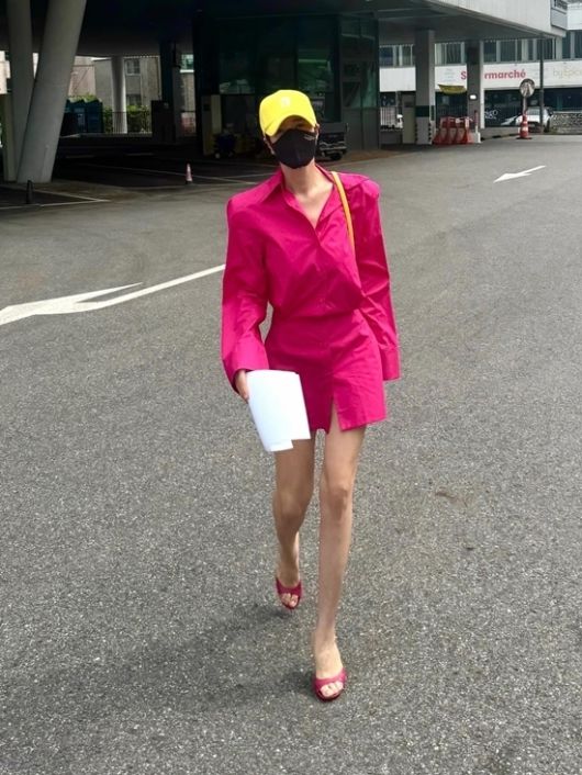 공개된 사진에는 핫핑크 셋업과 샛노란 볼캡을 쓴 김혜쑤의 모습이 담겼다. 명품 각선미가 눈길을 끈다.