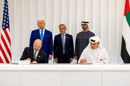 지난 5월 15일 아랍에미리트(UAE) 아부다비에서 열린 ‘미국-UAE 인공지능 가속화 파트너십’ 협정 체결식에서 도널드 트럼프(뒷줄 왼쪽) 미 대통령, 엔비디아의 젠슨 황(뒷줄 가운데) 최고경영자, 모하메드 빈 자예드 알 나흐얀(뒷줄 오른쪽) UAE 대통령이 양국 상무 장관의 협정 서명 장면을 지켜보고 있다./AFP 연합뉴스 |