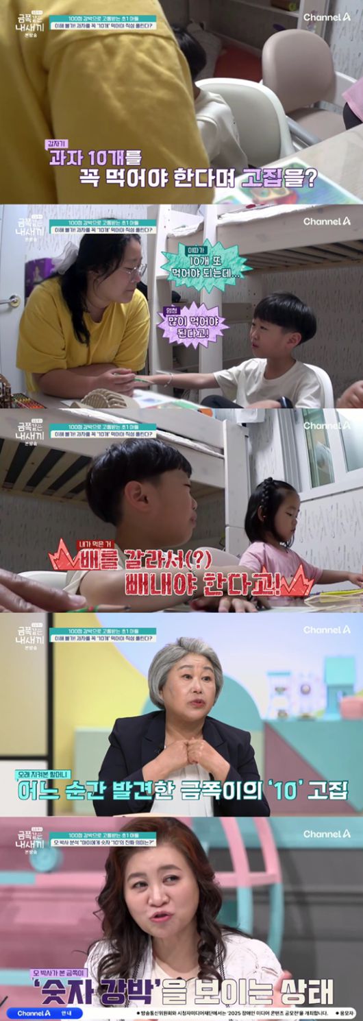 이날 금쪽이는 한자 공부를 시작하자 냉장고에서 과자를 가져와 먹기 시작했다. 과자 2개를 먹고 엄마가 제지하자 "과자 10개 먹어야 된다. 8개 더 먹어야 한다. 8개만, 제발. 아니면 이따가 10개 더 먹어야 한다"라며 칭얼거렸다.