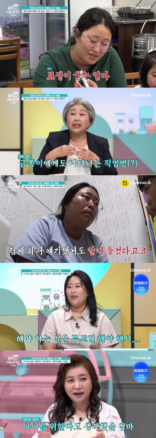 할머니는 "애가 울면서 하지 않나. 그러면 하는 것 자체가 예쁘지 않나"라고 이야기했고 엄마는 "당연히 해야하는 것. 할 일은 해야하지 않나"라며 단호하게 말했다. 할머니는 금쪽이 엄마가 유치원 교사 출신이라고 설명했다.