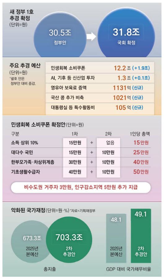 우선 전 국민에게 소득에 따라 차등 지급하는 소비쿠폰 발행에 들어가는 국비 지원 예산 규모가 1조9000억원가량 늘었다. 70~80%였던 국비 부담률을 최대 90%까지 늘리고, 비수도권과 인구감소지역 주민에게 1인당 3만~5만원을 더 지급하기로 했기 때문이다. 소비쿠폰은 두 차례에 걸쳐 신용카드, 선불카드, 지역사랑상품권(지역화폐) 등으로 지급된다. 개인별 소득과 거주지에 따라 액수가 달라진다.