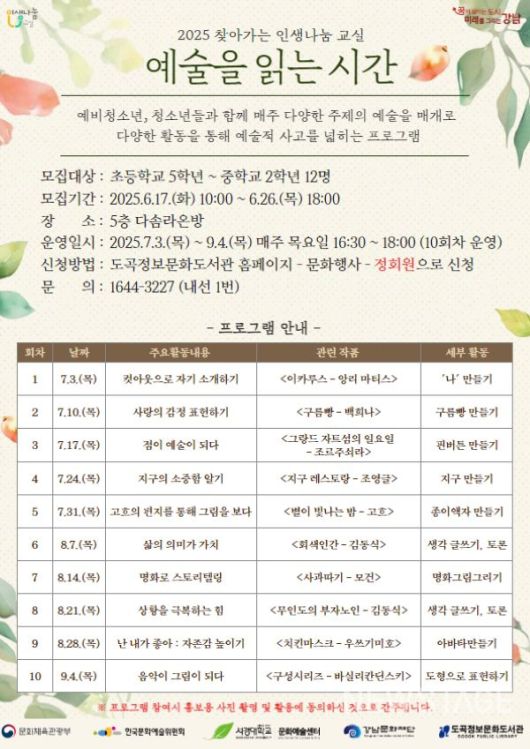 강남문화재단에서 운영하는 도곡정보문화도서관이 오는 3일(목)부터 9월 4일(목)까지 매주 목요일마다 청소년을 위한 2025 찾아가는 인생나눔교실 '예술을 읽는 시간'을 운영한다.