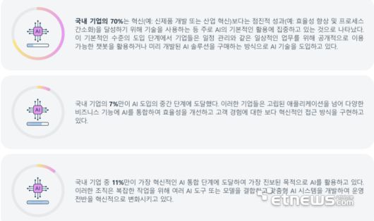전체의 7%만이 고객경험 개선 등 AI를 여러 기능에 걸쳐 통합 활용하는 '중간 단계'에 진입했다. 전체의 11%는 제품 개발, 전략적 의사결정, 비즈니스 모델 수립, 복잡한 문제 해결 등 기업 운영 핵심에 AI를 통합한 '변혁적 단계'에 도달한 것으로 나타났다.