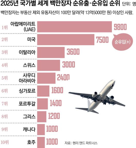 한국을 떠나 해외로 이주하는 백만장자들이 늘고 있다. 글로벌 투자이민 자문사 ‘헨리 앤드 파트너스’가 지난달 발표한 ‘2025년 부의 이동 보고서’에 따르면 올해 한국을 떠나는 백만장자 순유출 규모가 2400명에 달해 순유출 순서로 세계 4위에 오를 것으로 전망됐다. 한국보다 부자가 더 많이 빠져나갈 것으로 추산되는 국가는 영국(1만6500명), 중국(7800명), 인도(3500명) 등 세 곳에 불과하다.
