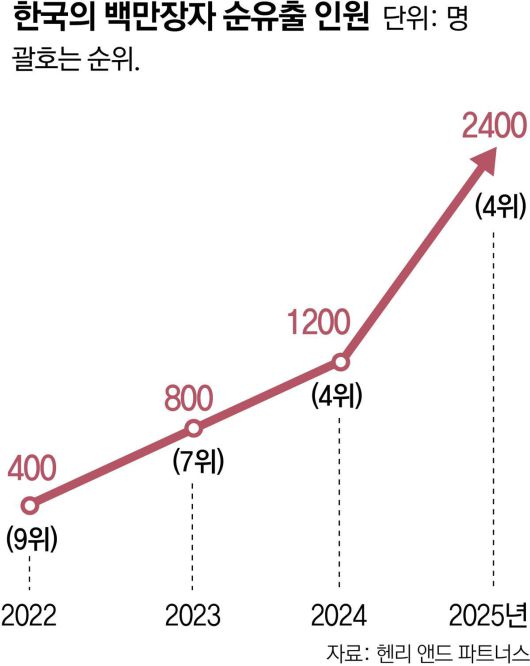 눈여겨볼 점은 해당 기관에서 집계한 한국 이탈 백만장자 수가 매년 크게 늘고 있다는 점이다. 한국의 백만장자 순유출 규모는 2022년 400명이던 것이 올해 2400명으로 3년 만에 6배로 늘었다. 전 세계 부자 유출 순위도 같은 기간 9위에서 4위까지 상승했다.