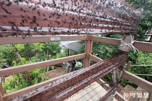 4일 인천 계양구 계양산 정상에서 환경부와 계양구 방제인력과 직원이 살수기를 이용해 이른바 ‘러브버그’라고 불리는 붉은등우단털파리에게 물을 뿌리고 있다. 러브버그는 살충제에 대한 내성이 강해 약제를 쓰면 다른 곤충만 피해를 입을 수 있다. 이 때문에 러브버그에게 물을 뿌리고 땅에 떨어뜨려 죽게 하는 방법이 활용되고 있다. 난간에 부착된 방제용 ‘끈끈이’에는 러브버그 사체가 빼곡하게 붙어 있다. 인천=신원건 기자 laputa@donga.com |
