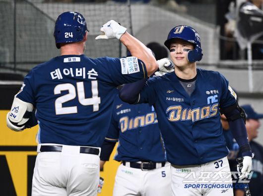 2일 대전 한화생명볼파크에서 열린 NC-한화전. 7회초 1사 데이비슨이 솔로포를 친 후 박건우의 축하를 받고 있다. 대전=정재근 기자 cjg@sportschosun.com/2025.7.2/ |