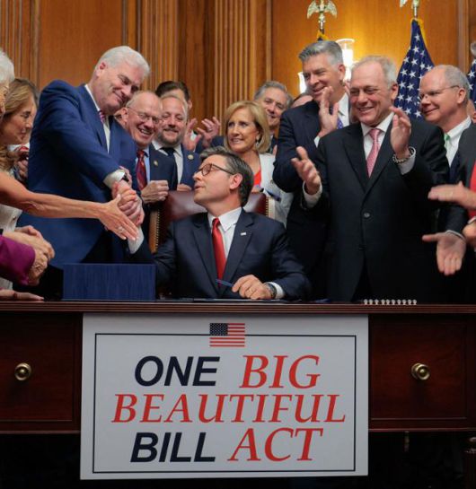 도널드 트럼프 미국 행정부의 주요 입법 과제를 담은 '하나의 크고 아름다운 법안'이 3일 하원에서 가결된 후, 공화당 소속 마이크 존슨(가운데) 하원의장이 워싱턴 국회의사당에서 같은 당 의원들로부터 축하받고 있다. 워싱턴=AFP 연합뉴스