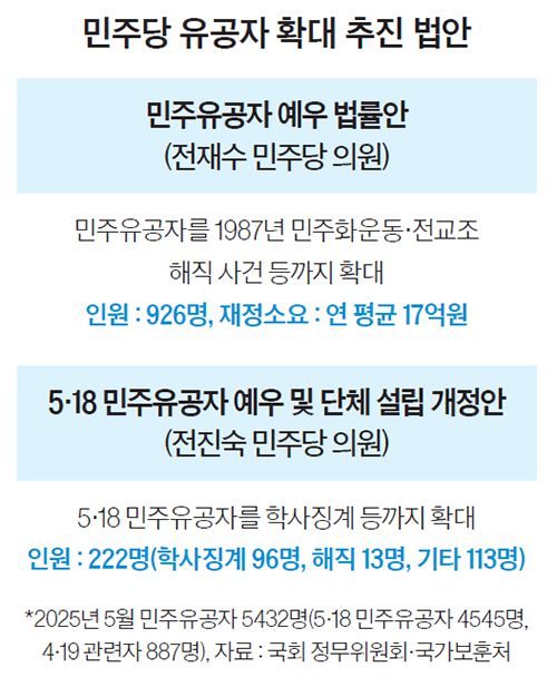 전재수 민주당 의원도 유사한 법안(민주유공자 예우에 관한 법률안)을 냈는데, 1970년대 부마민주항쟁과 87년 6월 민주화운동 등의 유족이나 가족에게 의료·양로 등을 지원하고, 민주화운동 관련한 시설물이나 교양 시설을 설치할 수 있도록 하는 내용을 담았다. 이 법안은 지난해 5월 윤석열 전 대통령이 거부권을 행사해 무산됐다. 하지만, 지난 대선에서 정권이 교체된 만큼 ‘차질 없이’ 진행될 것이라고 여권은 말하고 있다. 국회 정무위에선 926명이 추가 혜택을 볼 것이라고 예상했다. 유가족을 합산하면 수혜 대상자는 더 많아진다.