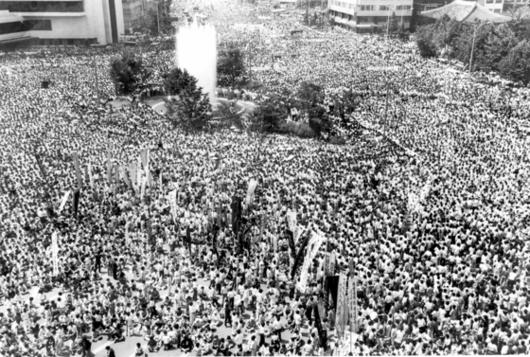 1987년 6월 민주화운동 당시 숨진 이한열 열사 장례식에서 서울시청 일대를 가득 메운 추도 인파. 민주당 등에서는 이에 관련된 인사들도 유공자로 지정해 예우하는 법안을 추진하고 있다. [중앙포토] |
