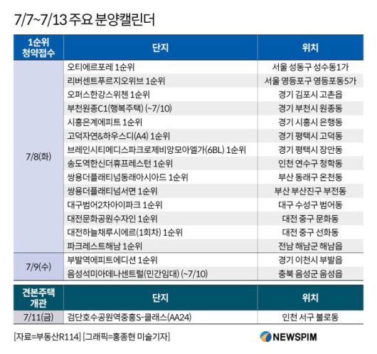 [서울=뉴스핌] 송현도 기자 = 5일 부동산R114에 따르면, 7월 둘째 주 전국 16개 단지에서 총 8845가구(일반분양 6089가구)가 분양을 시작한다.