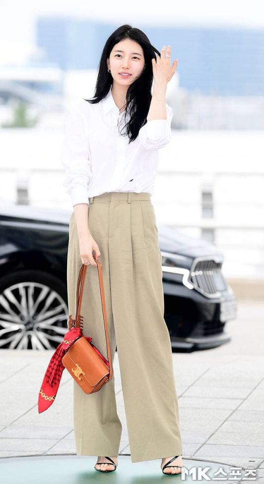 공개된 사진에서 수지는 흰 셔츠와 베이지 톤 와이드 팬츠를 매치해 클래식하면서도 단정한 무드를 연출했다.