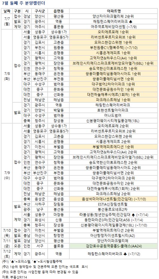 부동산 정보업체 부동산R114에 따르면 7월 둘째 주에는 전국 16개 단지 총 8845가구(일반분양 6089가구)가 분양을 실시한다. 대구 수성구 범어동 ‘대구범어2차아이파크’, 서울 성동구 성수동1가 ‘오티에르포레’, 서울 영등포구 영등포동5가 ‘리버센트푸르지오위브’, 경기 김포시 고촌읍 ‘오퍼스한강스위첸’ 등이다.