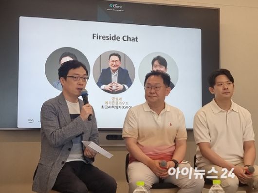 (왼쪽부터)김선수 AWS AI·ML 사업개발 수석 스페셜리스트, 공성배 메가존클라우드 CAIO, 정진우 트웰브랩스 공동창업자 겸 사업개발 이사가 4일 서울 강남구 AWS코리아 오피스에서 열린 간담회에서 기자들의 질문에 답하고 있다. [사진=윤소진 기자] |