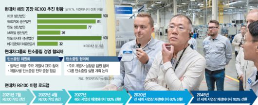 정 회장은 현대차그룹의 저탄소 경영을 선도해 유럽 등의 강력한 탄소 배출 규제에 선제 대응한다는 구상이다. 유럽연합(EU)은 내년 6월부터 자동차 생산, 사용, 폐기에 이르는 모든 과정에서 발생하는 탄소 배출량을 산출하는 전과정평가(LCA)를 도입한다. 차량 주행에 따른 탄소 배출 규제에서 한발 나아가 자동차 생산 과정에서 발생하는 탄소 배출량까지 따져 규제하려는 조치다. 재생에너지 사용 비중이 높은 공장에서 생산된 차량은 탄소세 부과 등 규제에서 자유로울 수 있다는 의미다.