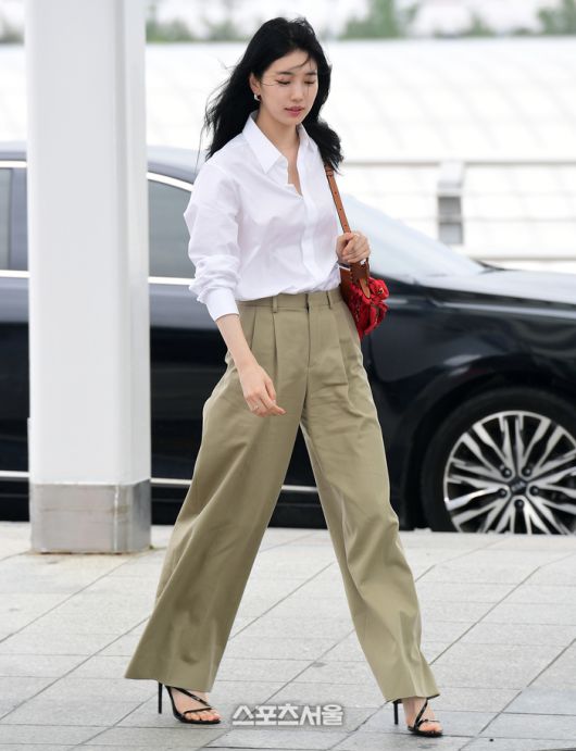 소품이랄 수 있는 크림 톤 샌들과 브라운 색상의 미니 가죽백 그리고 백에 묶은 레드 스카프는 의상과 어우러지며 수지를 영화 속의 여주인공으로 순식간에 빙의시키는 마력을 뿜어냈다. 포토그래퍼들의 요청에 수지는 특유의 수줍은 듯한 화사한 표정을 지어 현장을 더욱 환하게 만들었다. 잠시 동안이었지만 인천공항은 수지를 위해 급조된 런웨이로 탈바꿈한 공간이 되었다.