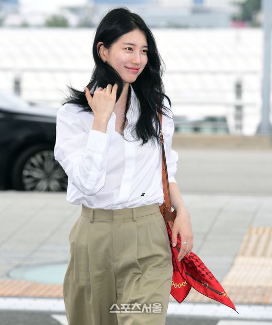 소품이랄 수 있는 크림 톤 샌들과 브라운 색상의 미니 가죽백 그리고 백에 묶은 레드 스카프는 의상과 어우러지며 수지를 영화 속의 여주인공으로 순식간에 빙의시키는 마력을 뿜어냈다. 포토그래퍼들의 요청에 수지는 특유의 수줍은 듯한 화사한 표정을 지어 현장을 더욱 환하게 만들었다. 잠시 동안이었지만 인천공항은 수지를 위해 급조된 런웨이로 탈바꿈한 공간이 되었다.