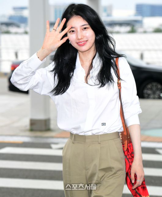 소품이랄 수 있는 크림 톤 샌들과 브라운 색상의 미니 가죽백 그리고 백에 묶은 레드 스카프는 의상과 어우러지며 수지를 영화 속의 여주인공으로 순식간에 빙의시키는 마력을 뿜어냈다. 포토그래퍼들의 요청에 수지는 특유의 수줍은 듯한 화사한 표정을 지어 현장을 더욱 환하게 만들었다. 잠시 동안이었지만 인천공항은 수지를 위해 급조된 런웨이로 탈바꿈한 공간이 되었다.