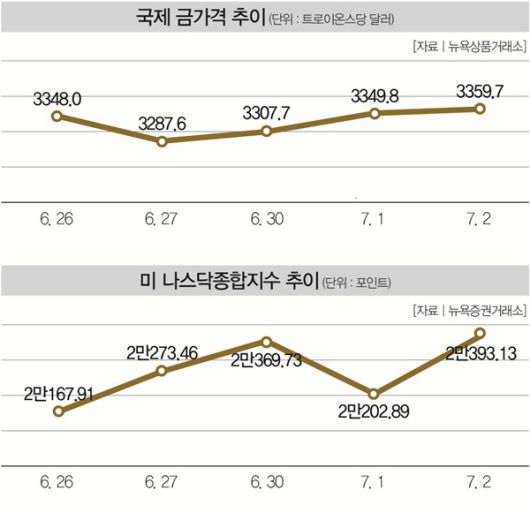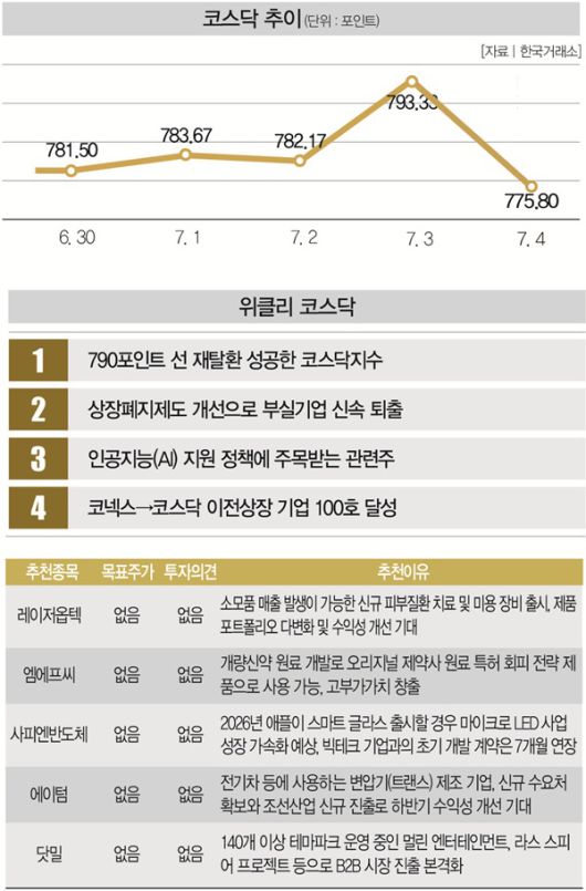 # 상승세는 오래가지 않았다. 4일엔 국내 증시가 일제히 하락했다. 하락폭도 적지 않았다. 코스피지수는 1.99% 떨어진 3054.28포인트를 거래를 마쳤다. 코스닥지수는 2.21% 하락한 775.80포인트를 기록하며 단숨에 770포인트대로 밀려났다. 도널드 트럼프 대통령의 상호관세 강경 발언과 차익 실현 매물이 증가한 것이 악재로 작용했다. 미국의 6월 고용지표가 시장의 예상치를 웃돌면서 연방준비제도(연준·Fed)의 금리인하 기대감이 약화한 것도 부정적인 영향을 미쳤다.