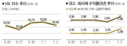 한국은행의 7월 기준금리 결정을 앞두고 채권 금리가 횡보세를 이어갔다. 국고채(3년물) 금리는 2.45~2.48%를 벗어나지 않았다. 회사채(3년물) 금리도 2.96~2.98%대에서 등락을 거듭했다. 시장에선 금리인하 신중모드에 힘이 실리고 있다. 정부가 부동산 대출 규제에 나선 상황에서 금리를 낮추면 정책의 효과가 반감할 수 있다는 우려가 커지고 있어서다. 한은은 오는 10일 어떤 결정을 내릴까.
