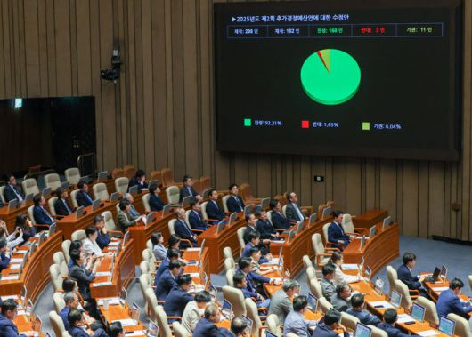 4일 오후 서울 여의도 국회에서 열린 제426회국회(임시회) 제5차 본회의에서 2025년도 제2회 추가경정예산안이 재적 298인, 재석 182인, 찬성 168인, 반대 3인, 기권 11인으로 통과되고 있다. |