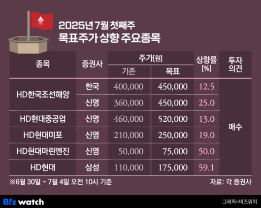엄 연구원은 먼저 HD한국조선해양을 최선호주로 꼽고 목표가를 36만원에서 45만원으로 올렸다. HD한국조선해양은 HD현대 계열사의 중간 지주사 역할을 한다. 그는 "HD한국조선해양은 그룹의 조선사업 가치가 몰리는 곳"이라며 "성장성과 안정성을 겸비했다"고 호평했다.