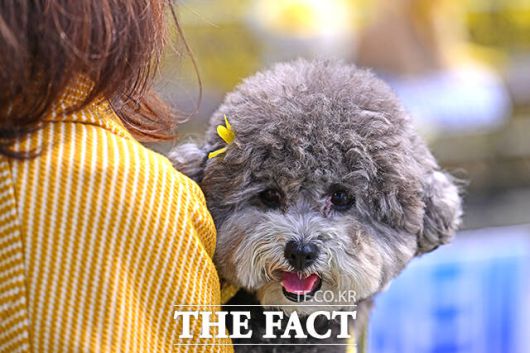 개나리핀을 꽂은 반려견이 주인 품에서 봄나들이를 즐기고 있다. /더팩트 DB |