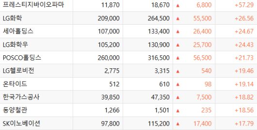 LG헬로비전(19.46%), 온타이드(19.14%), 한국가스공사(18.82%) 등도 상승했다. 온타이드의 경우 최대주주가 경영권을 매각한다는 소식이 전해진 영향을 받은 것으로 풀이된다.