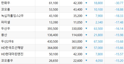 같은 기간 유가증권시장에서 가장 많이 하락한 종목은 한화우로 30.77% 떨어진 4만2300원을 기록했다. 지난달 말 한화우 소수주주들은 사측이 자사주 소각으로 상장폐지를 추진하는 것으로 의심된다며 우선주의 보통주 전환 등 주주 보호 대책을 촉구한 바 있다.