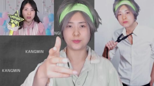 코미디언 강유미가 자신의 유튜브 ‘좋아서 하는 채널’에서 패러디한 아이돌 영상통화 팬 사인회 모습. 막대한 팬 사인회 비용을 지불한 팬에게 아이돌이 해서는 안 되는 ‘금기’ 행동이 모두 담겨 있다. 강유미 ‘좋아서 하는 채널’ 갈무리 |