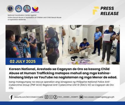 5일 GMA 등 필리핀 언론과 아동 성학대 및 착취 방지 국가조정센터(NCC-OSAEC-CSAEM)에 따르면 지난달 필리핀 북부 민다니오 지역의 카가얀데오로시에서 한국인 남성 A씨가 아동학대·착취, 차별금지법 및 인신매매방지법 위반 혐의로 현지서 체포됐다.