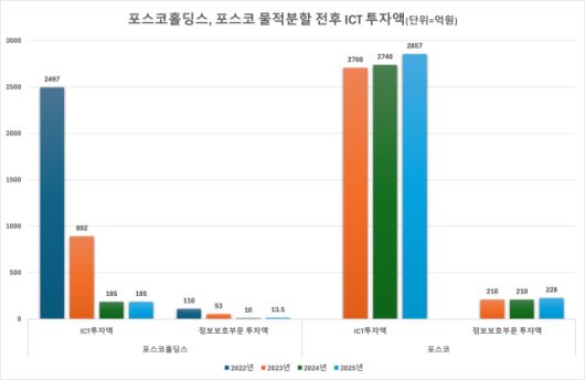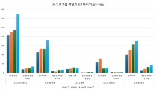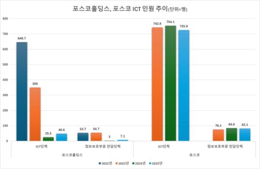 특히 그룹의 모태 격인 포스코는 2023년부터 본격적으로 ICT 및 보안 부문에 뛰어들었다. 2023년 2708억원을 시작으로 2025년에는 2857억원까지 확대되며, 같은 기간 정보보호 투자도 210억원에서 228억원으로 증가했다. 정보보호 전담 인력도 3년간 76.1명에서 82.1명으로 늘어나며, 인적 인프라 역시 탄탄히 다져가고 있다.