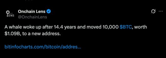 한 고래 투자자가 14년간 휴면 상태에 있던 비트코인 1만 개를 새로운 주소로 이전한 것이다.