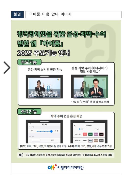 최철호 재단 이사장은 "이어줌앱 통합 버전을 통해 청각장애인들의 미디어 접근성을 한층 향상시킬 수 있게 됐다"며 "시험용 서비스로 제공되고 있는 아바타 수어 기능의 고도화를 추진하겠다"고 밝혔습니다.
