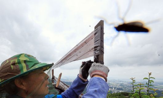 6월 30일 오후 인천 계양구 계양산 정상에 붉은등우단털파리(러브버그) 무리가 대량 출몰한 가운데 계양구청 공원녹지과 산림보호팀 관계자들이 방역 및 날벌레 트랩을 설치하고 있다. 뉴스1 |