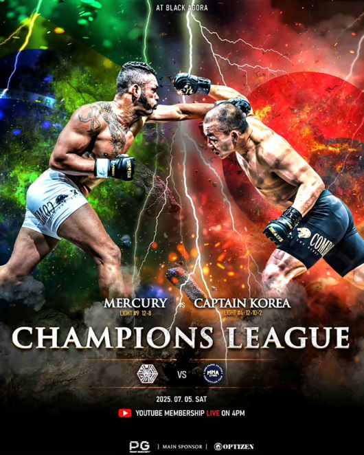 경기도 오산시 블랙아고라에서는 7월5일 블랙컴뱃 챔피언스리그 시즌2 13주차가 종합격투기(MMA) 9경기 규모로 열린다. 플라비우 산투스(34·브라질)와 ‘캡틴 코리아’ 정한국(33·울산팀매드)의 계약 체중 72㎏ 5분×3라운드가 메인이벤트로 흥행을 책임진다.