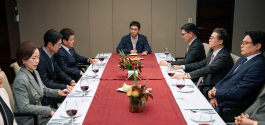 그 가운데, 5일 본방송을 앞두고 민주영이 인성시의 핵심 권력자들과 비밀리에 회동하는 현장이 스틸을 통해 선공개됐다. 인성 시장 노덕규(성지루 분), 인성경찰청장 조판열(김응수 분), 부장 검사(이윤재 분) 등을 비롯한 검·경, 행정을 대표하는 고위 인사들이 모두 한데 모여 있다는 사실은 그가 단순한 빌런을 넘어 인성시 전반을 주무르는 막강한 권력의 중심임을 실감케 한다. 무엇보다 인성시 불법운영 업소를 무더기로 고발중인 시민 영웅이 윤동주란 걸 한눈에 알아본 민주영이 이들을 한 자리에 모은 이유 역시 궁금해진다.