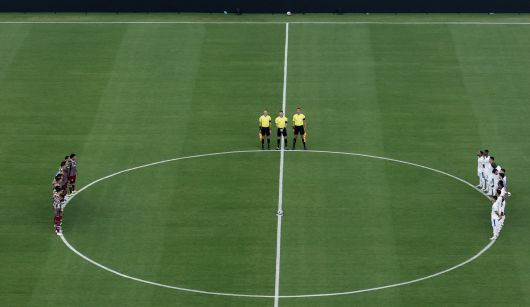 플루미넨시와 알힐랄 선수들이 5일 클럽월드컵 8강전을 앞두고 갑작스러운 사고로 세상을 떠난 조타를 위한 추모 묵념을 했다. [로이터=연합뉴스] |