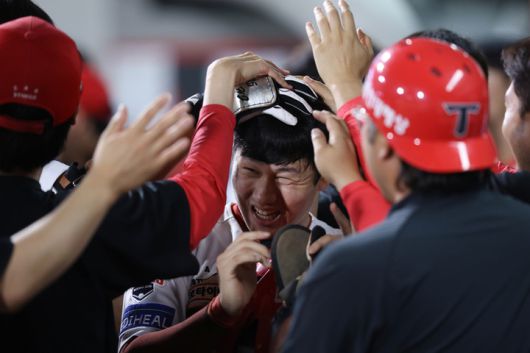 득점 이후 덕아웃에서 동료들의 축하를 받는 KIA 박민. |