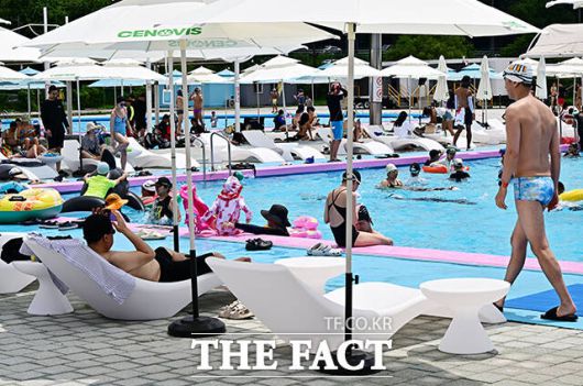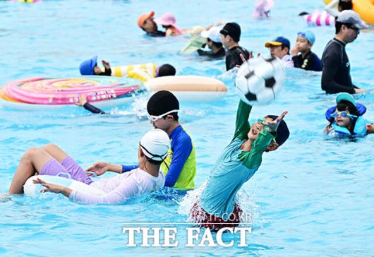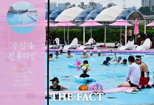 [더팩트ㅣ배정한 기자] 전국에 폭염특보가 발효된 5일 오후 서울 서초구 잠원 한강지구 야외수영장에서 시민들이 물놀이를 하며 무더위를 식히고 있다.