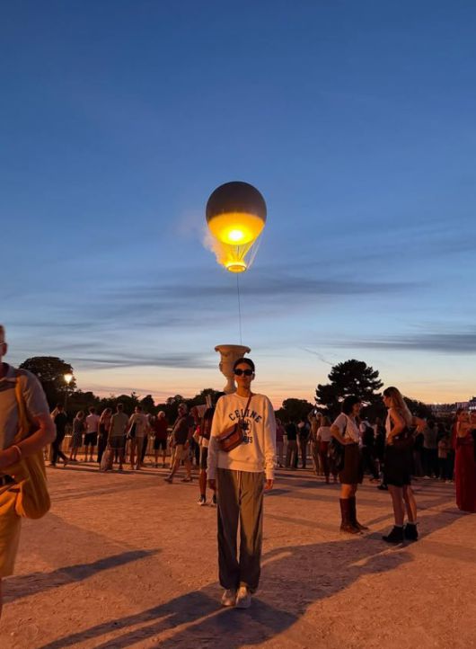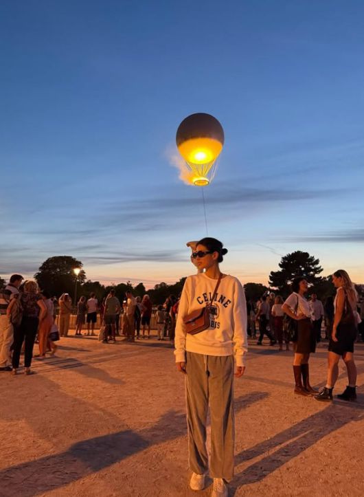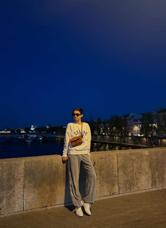 이날 착용한 아이템으로는 셀린느의 오버사이즈 CELINE 스웨트 셔츠, 트랙수트 팬츠, 클래식 트리옹프 백으로 전반적으로 꾸미지 않은 듯 자연스러운 스타일이지만, 파리지앵처럼 여유로운 분위기를 자아냈다.