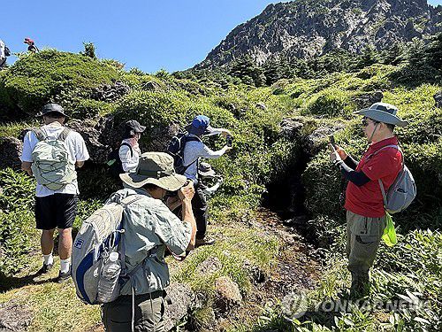 5일 한라산 해발 1천675m 백록샘. 이날 전문가와 언론을 대상으로 진행된 백록샘 공개 행사에서 제주도 세계유산본부 한라산연구부 김종갑 생물권지질공원연구과장은 "화산 지형인데도 이렇게 높은 고도에서 샘이 난다는 것 자체가 지질학적 연구 대상으로, 생태적으로 매우 가치가 높다"며 이같이 말했다.