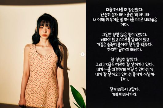 이어 서유리는 “그동안 정말 많은 일이 있었다. 버텨야 했고 스스로를 달래야 했고 가끔은 숨죽여 울어야 할 만큼 벅찼다. 하지만 끝까지 해냈다”라며, “참 열심히 살았다. 그리고 지금도 여전히 잘 살아가고 있다. 내가 나를 대견하게 여길 수 있다는 게 내가 잘 살아오고 있다는 증거가 아닐까 한다”라면서 어려움을 극복해낸 자신을 스스로 칭찬했다.