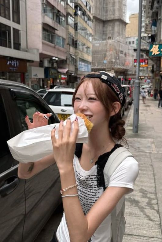사진 속 최준희는 반팔 티셔츠에 캡 모자를 쓰고 거리를 거닐며 음식을 먹는 모습이다.