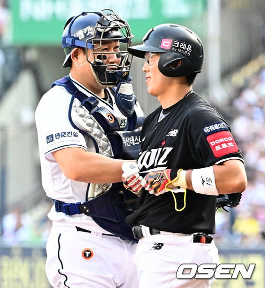 [OSEN=잠실, 지형준 기자] 5일 오후 서울 잠실구장에서 ‘2025 신한 SOL Bank KBO리그’ 두산 베어스와 KT 위즈의 경기가 열렸다. 두산은 최원준, KT는 쿠에바스를 선발로 내세웠다. 1회초 2사 1,2루에서 KT 허경민이 두산 최원준에 투구에 맞자 양의지가 미안함을 표시하고 있다. 2025.07.05 /jpnews@osen.co.kr