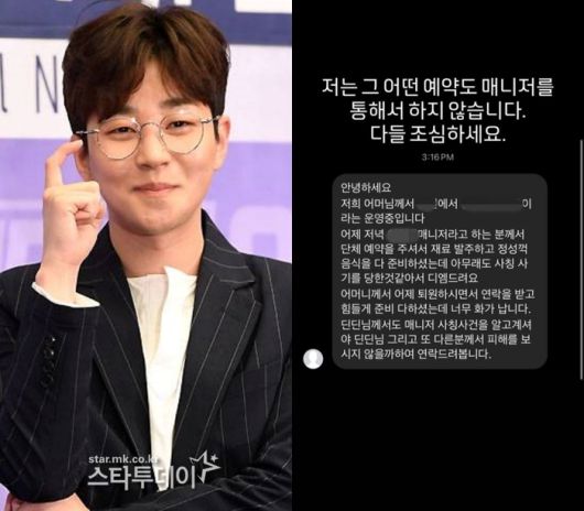 함께 공개된 사진에는 딘딘에게 보내온 메시지가 담겼다. 해당 메시지 발신인 A씨는 어머니가 가게를 운영 중인데, 딘딘의 매니저라고 사칭한 인물이 단체 예약을 해 사기 피해를 당한 것 같아 연락한다고 밝혔다.