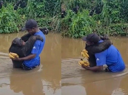 밀렵꾼에게 부모를 잃고 불법 거래에 팔려 갔던 고아 침팬지가 자신을 구해준 남성과 재회하자 반갑게 포옹하는 모습이 공유돼 감동을 주고 있다.